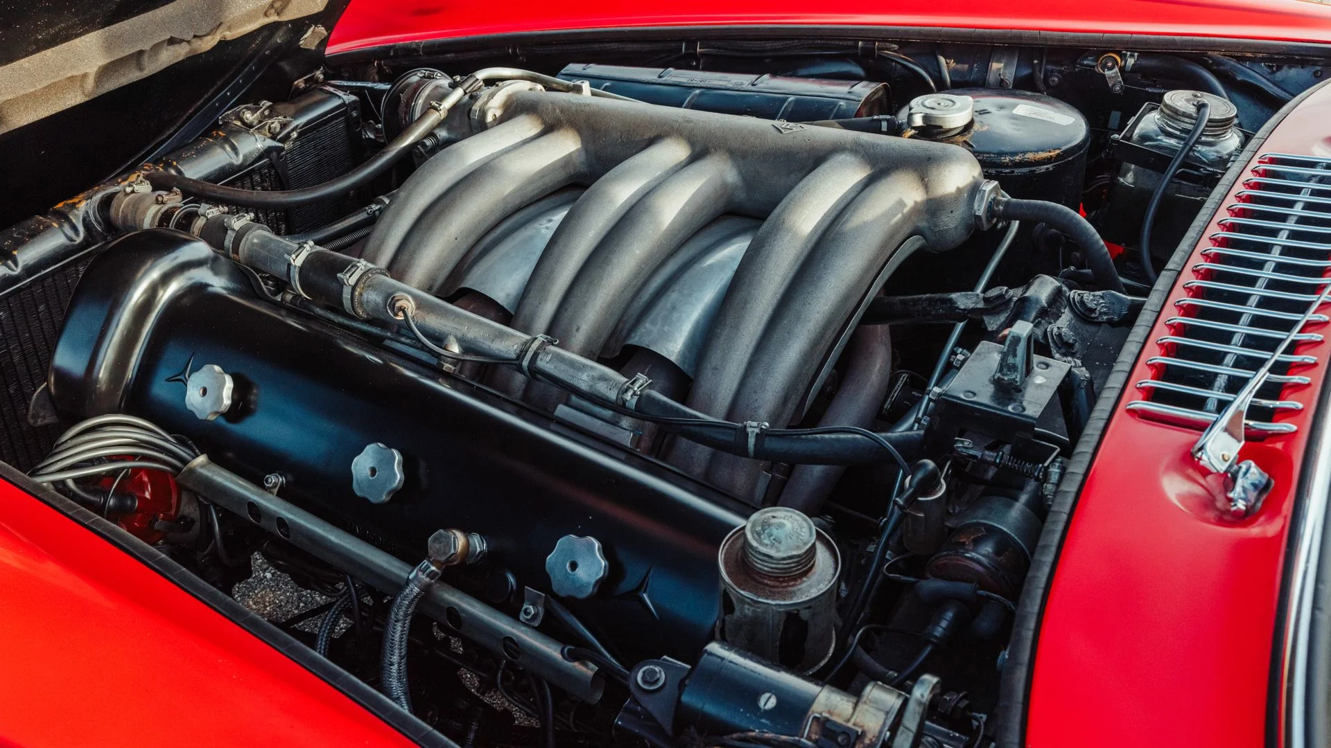 While only minor areas of the rear end lower parts were resprayed during the past 68 years, most of the bodywork proudly wears its original, factory applied coat of Fire Engine Red paintwork. Inside, the original Roser leather was expertly cleaned to remove the black surface dye that was applied early in its life revealing its original Cream color underneath. The engine compartment and undercarriage retains many original factory-applied paint markings along with the original tags and stickers still affixed to the coolant, oil reservoir, and fuel tank.
