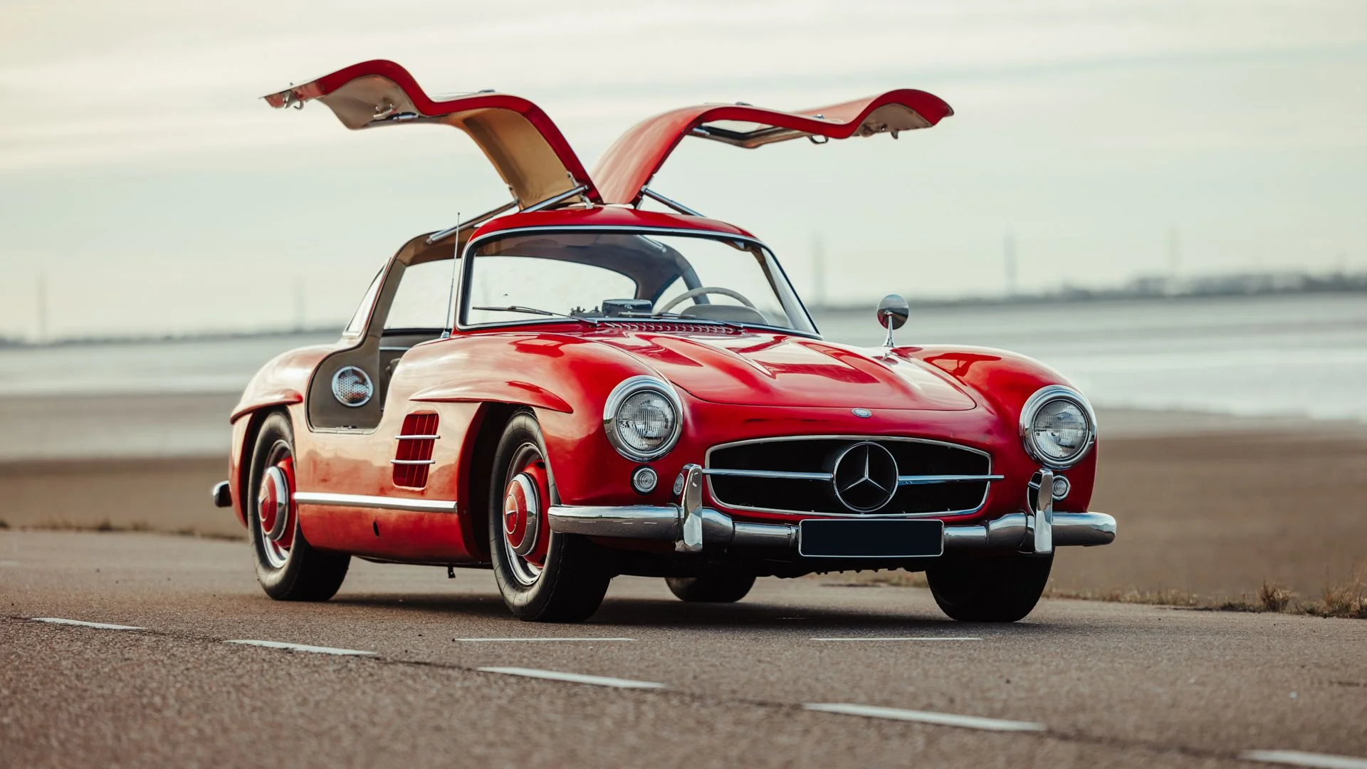 Beginning as order 856 350, this 300 SL Coupe, chassis 7500071, completed production on 13 May 1957. Only 70 Gullwings were produced in the final production year of 1957 with this car being the ninth-to-last chassis ever produced by Mercedes and, more importantly, the penultimate Gullwing delivered from the factory according to Eric Le Moine’s register. Ordered in Fire Engine Red (534) over a special-order Cream Leather (1060) interior, it was additionally equipped with a Becker Mexico radio, automatic antenna, bumper overriders, sealed-beam headlights, and instrumentation with English lettering. It also features the desirable 3.64 rear axle ratio for higher speed at lower revs, whereas 3.89 was standard for US-specification examples.