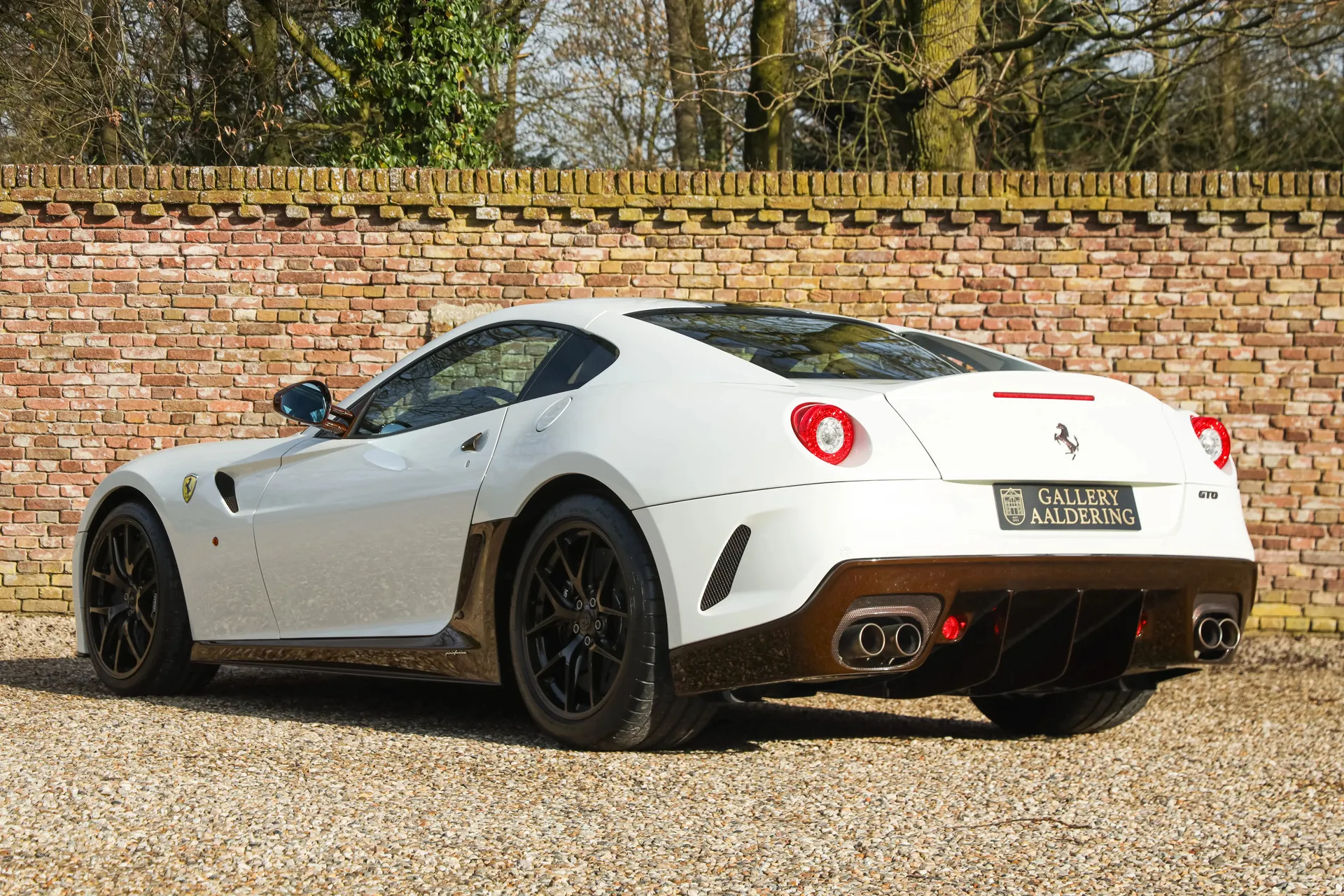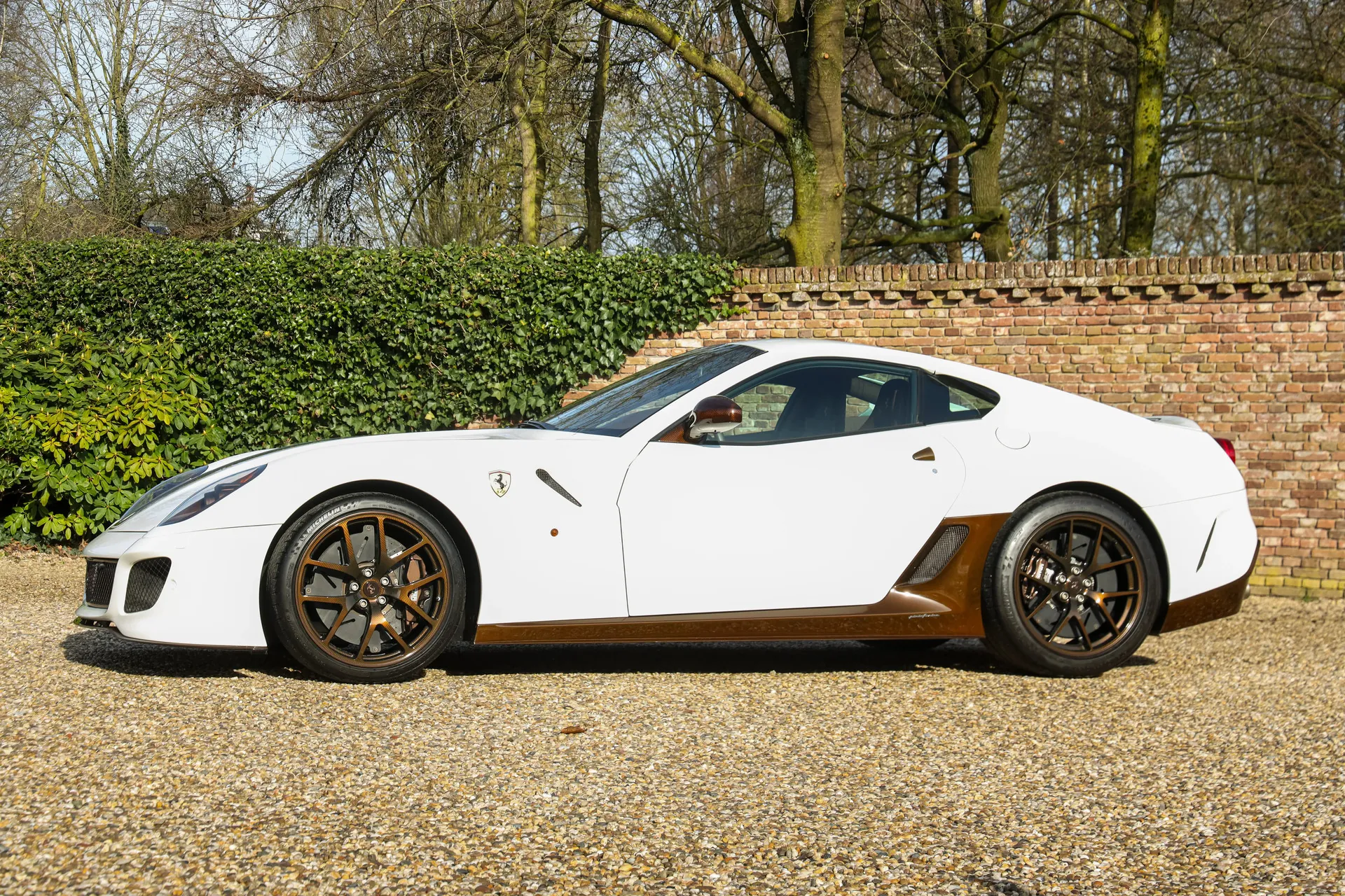 For this Ferrari a unique and tasteful specification was chosen. The body is finished in Bianco Perla Fuji Opaco with satin brown racing stripes. In addition several details are executed in brown carbon fiber, giving this 599 GTO a truly striking and elegant appearance.
