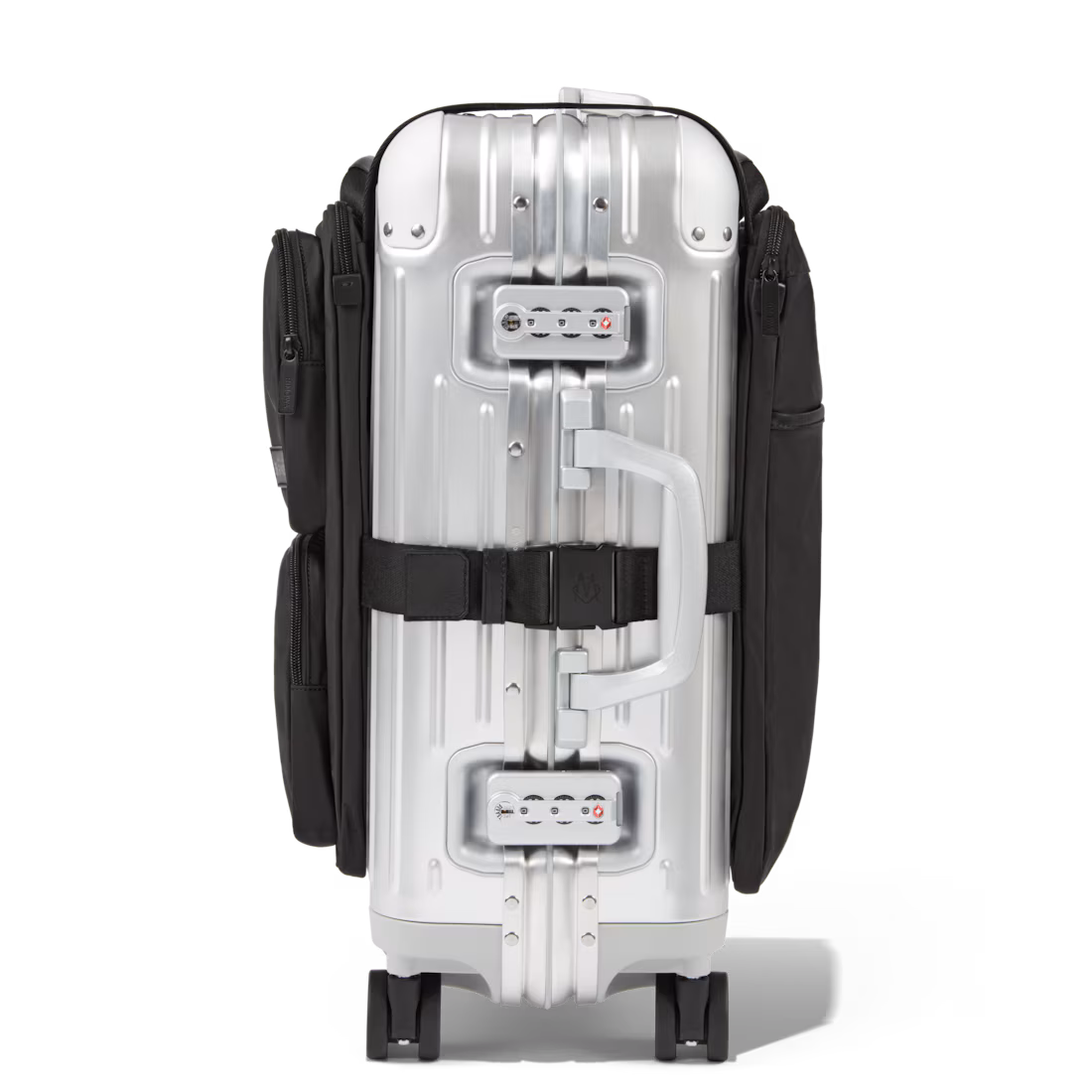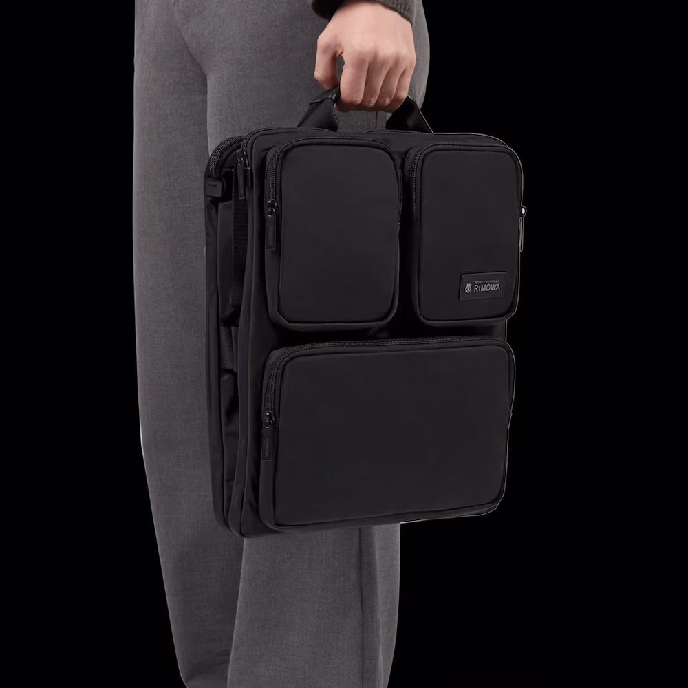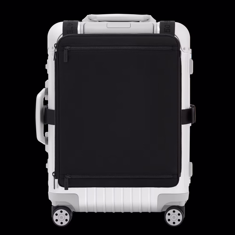 Conveniently secured to your RIMOWA Cabin suitcase using adjustable straps, it boasts cleverly placed pockets and compartments that offer easy access to your essentials such as phones, electronics and toiletry bags. Two large, zipped pockets can each fit a laptop of up to 16″ in size, or documents and magazines. To prevent imbalance from uneven weight, three non-slip silicone strips keep the panels securely in place.
