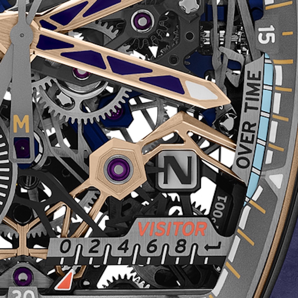 Crafted from microblasted grade 5 titanium, the movement architecture pushes the limits of technical feasibility. Baseplate and bridges are highly skeletonised to provide room for its 650 internal components. On the flyback chronograph side, two column wheels orchestrate a dance of levers and hammers. The chronograph’s overall design ensures a coherent and rational distribution of components without unnecessary layering that favours technical solutions to optimise functions.