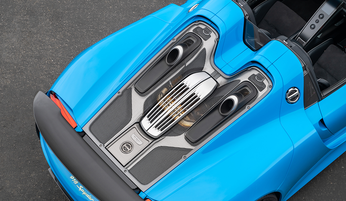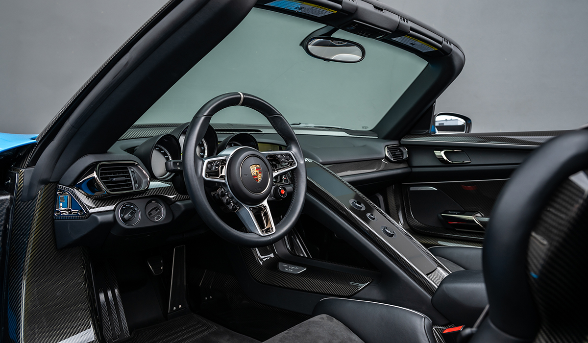 – The singular Paint to Sample Riviera Blue 918 Spyder with Weissach Package delivered to North America with a Black interior with Silver piping